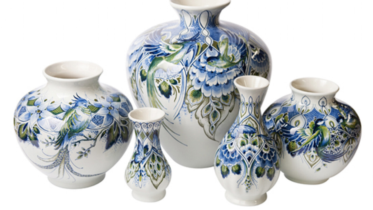 Admire our newest collection called Nature Design by Wilma Plaisier. The traditional shaped vases stand out by their unique colouring; a combination of Delft blue and different shades of green. The decor contains nature elements and the Jugendstil look.
