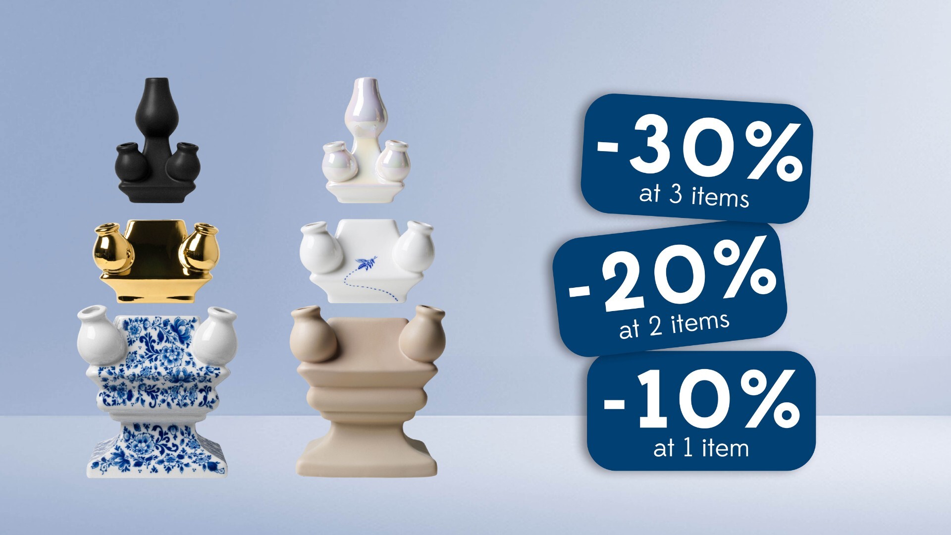 * Hand-painted components from the Stapelgekte collection are excluded from this discount promotion. Purchases made outside the promotion period cannot be retroactively discounted. The stated discount applies to all participating Stapelgekte components, including when 3x a top piece, 3x a middle piece, or 3x a bottom piece is selected.