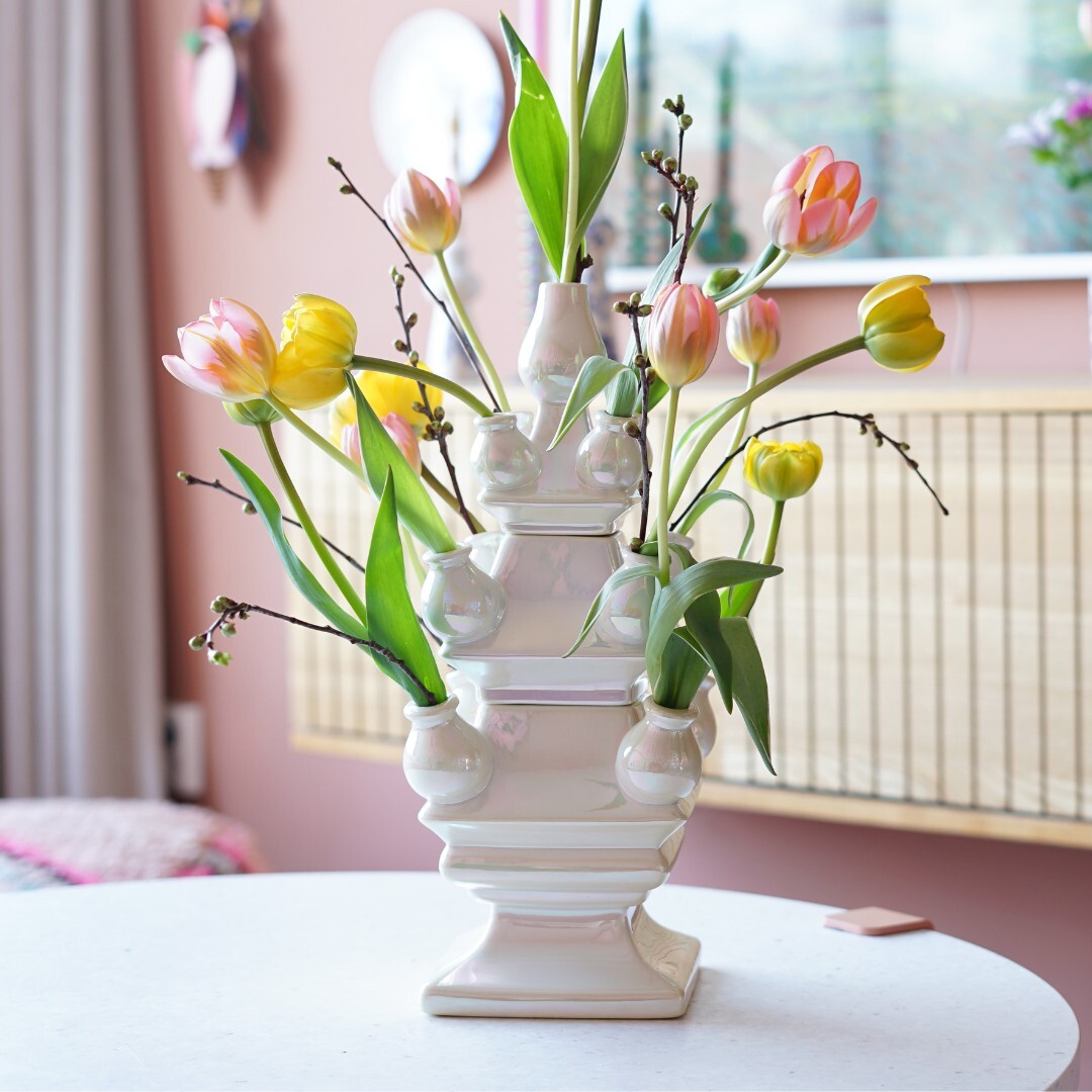 With the Stapelgekte collection, you can let your creativity run free. We completely deconstructed the traditional tulip vase and designed new, separate components. Now it’s up to you to stack your favorite combination together.